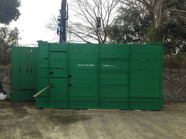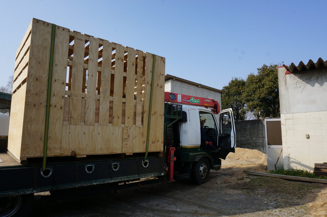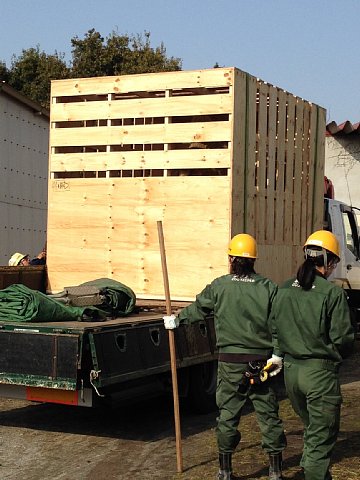 ユニックで箱を吊って、獣舎の入口に箱をセットします。