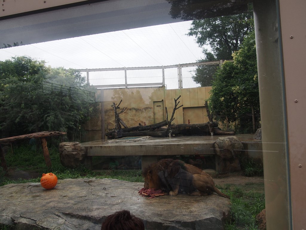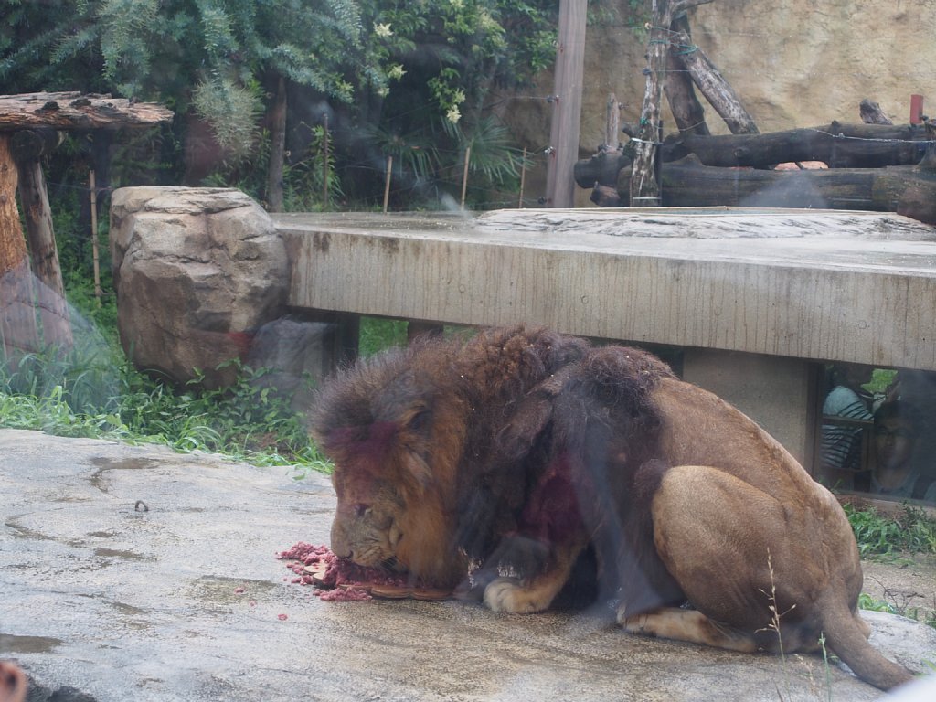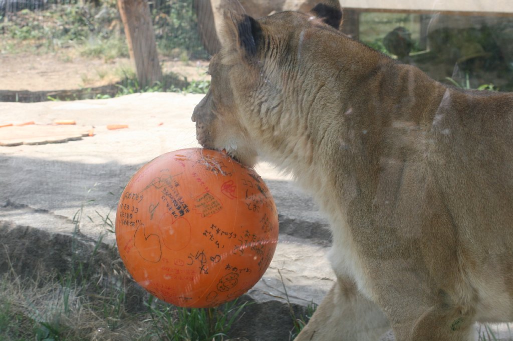 オスライオンは、ガイドやおやつコーナーで、いつもメスライオンがお肉を食べるので、イベントでケーキを食べてくれるか心配でしたが、すぐに食べ始め豪快に食べる様子が見られました。