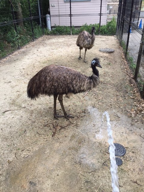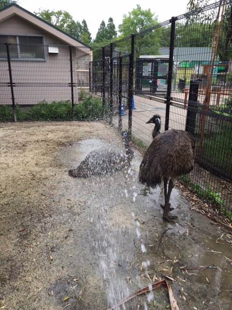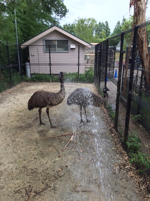 このエミューもこの猛暑は、さすがにこたえます。なので、ホースで水をかけてあげています。