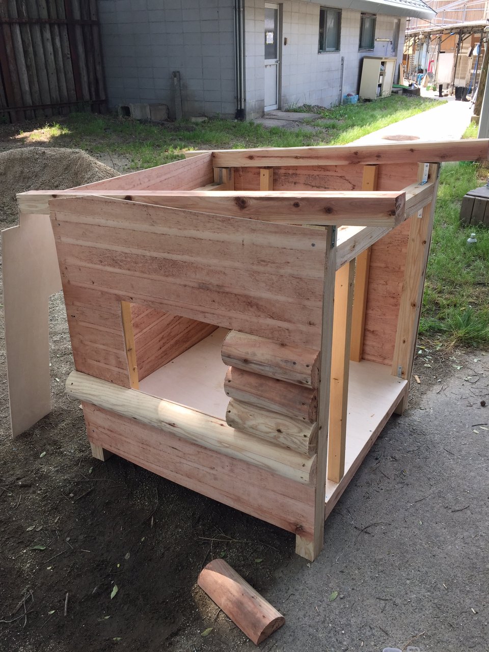 ログハウスをイメージして作ったのでベニヤ板の上から丸太を半分に切った半丸太と言われている木材をくっつけました。