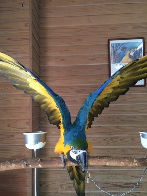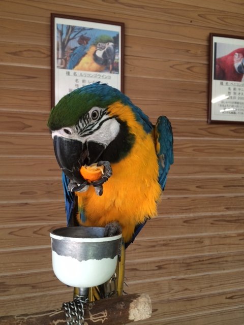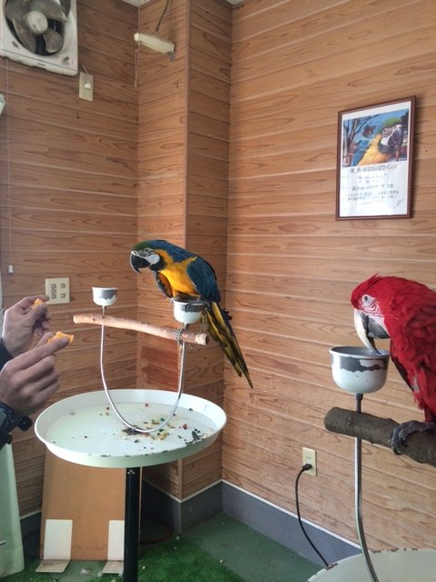 また、日中フクロウたちがいるふれあい動物の森内の森の教室には、2羽の美しいインコもいます。