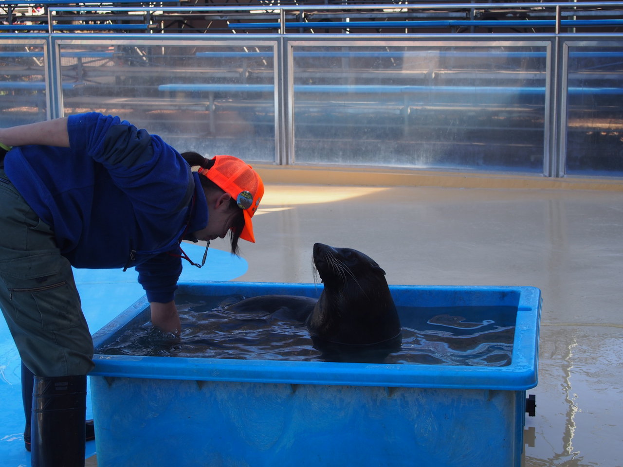 写真だとわかり辛いのですが、青い小さなプールに40°Cのお湯を張り、湯加減を直接確認しながらオットセイを温めています。