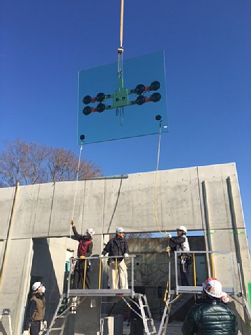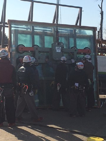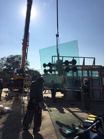 2、確認が終了ししだい、ガラスをクレーンではめ込む場所まで持っていきます。