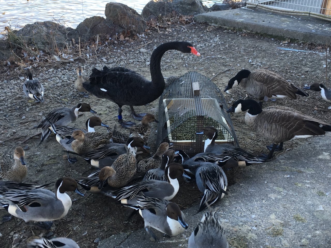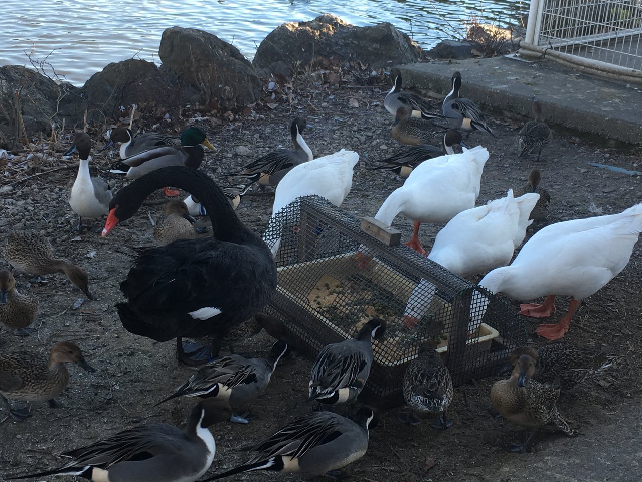 今のこの季節は、渡り鳥であるオナガガモやホシハジロやマガモなど、たくさんの野性のカモが池にやってきます。