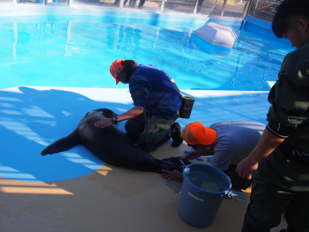 お湯に浸かる事で血管が浮き上がり、採血をスムーズに行う事が出来オットセイの負担を軽減できると考えています。