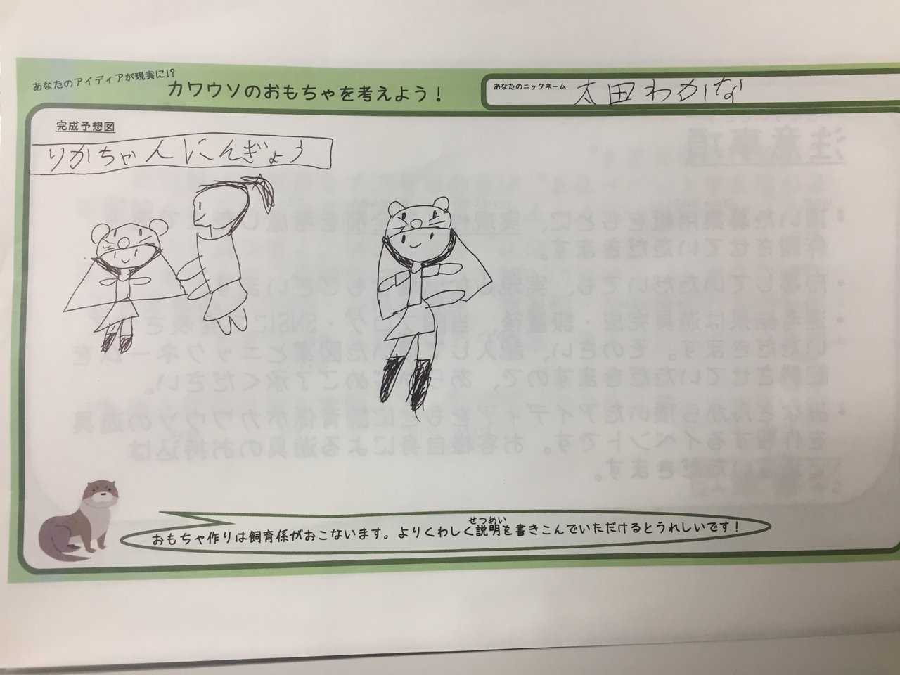 その名の通り、コツメカワウソの「まっちゃ」と「ふう」にプレゼントするおもちゃのアイディアを募集しているイベントなのです。(詳しくは当園のホームページをご覧ください)