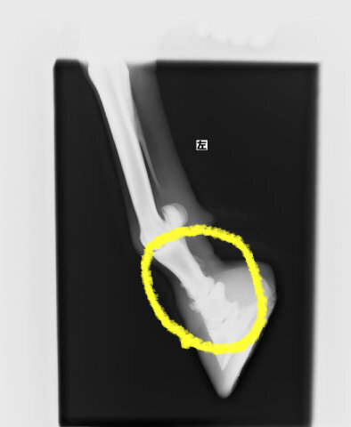 黄色で囲っている部分ですが、蹄の上の部分の蹄球部分が関節炎になっていました。