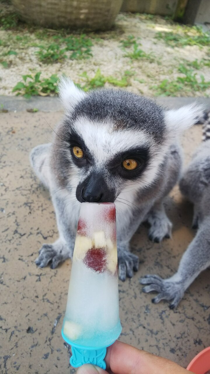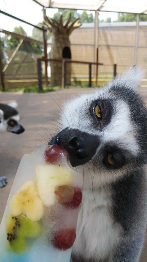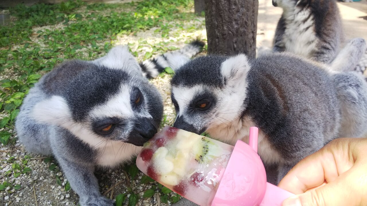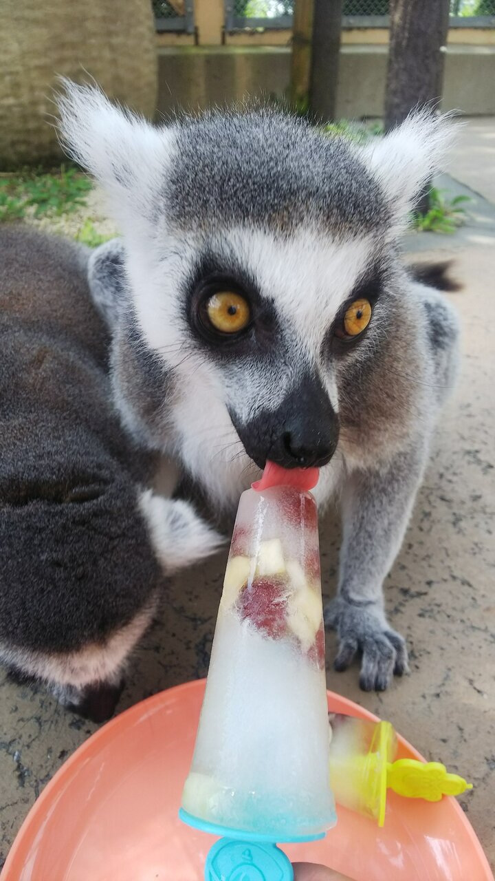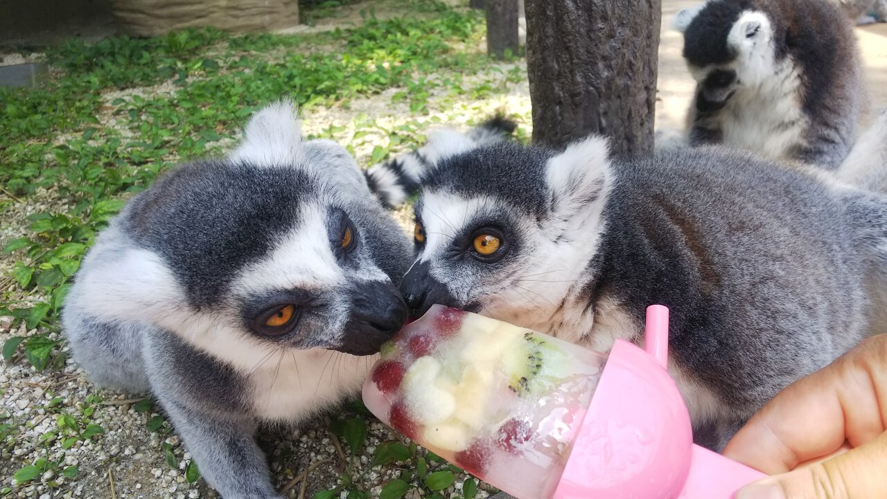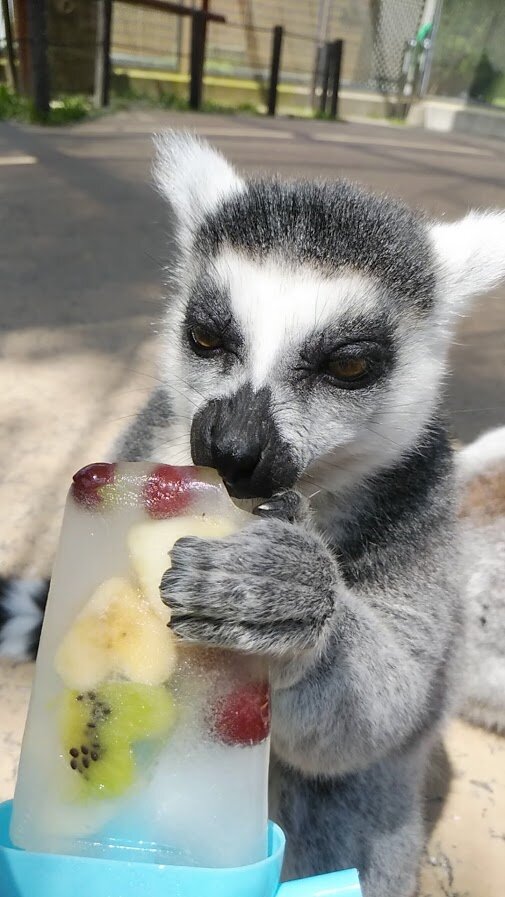 さて、こんなに暑いので、私の担当しているワオキツネザル達に少しでも