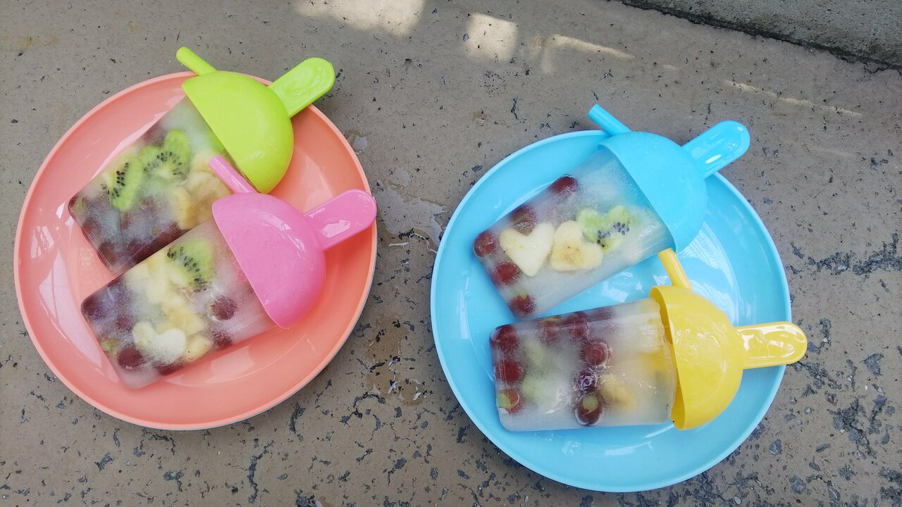 昨年に引き続き果物入りアイス。今年はバナナ、キュウリ、キュウイ、リンゴ、ブドウを