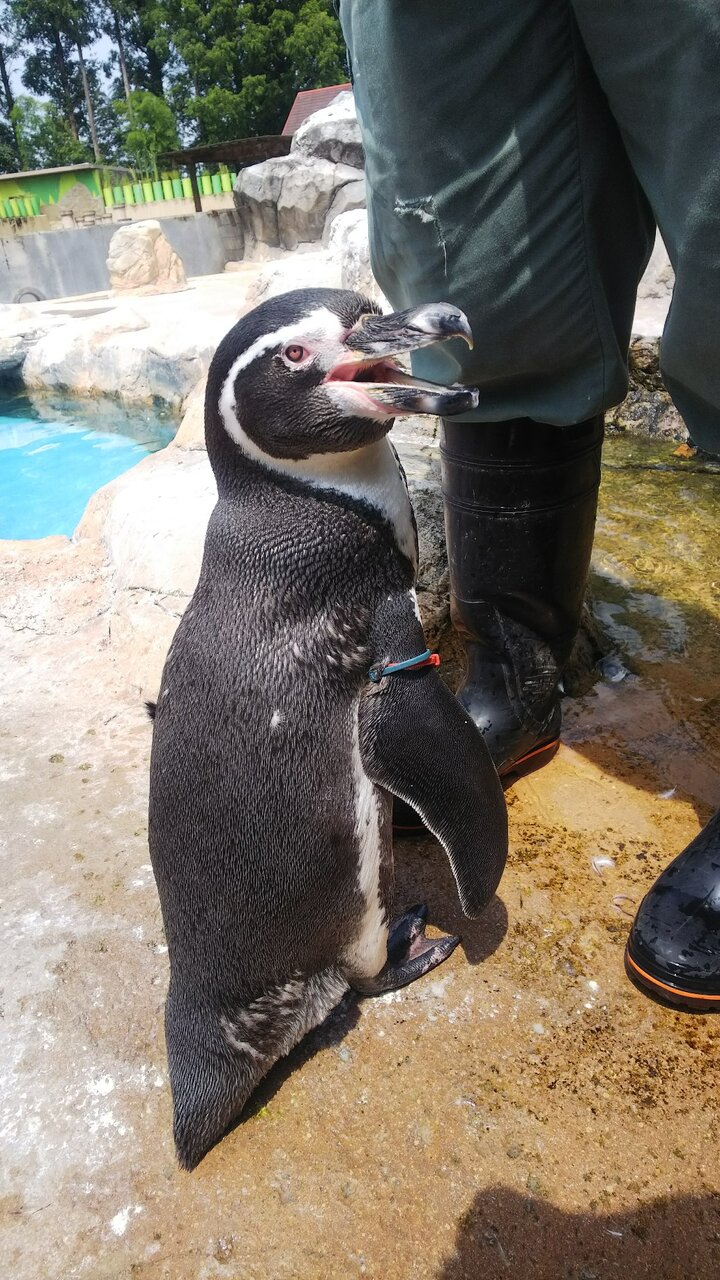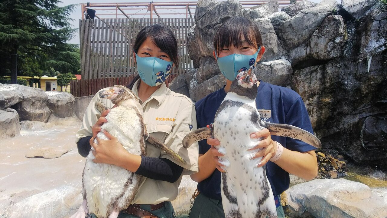 さっそくペンギン担当の2人にマスクを着用してもらい、