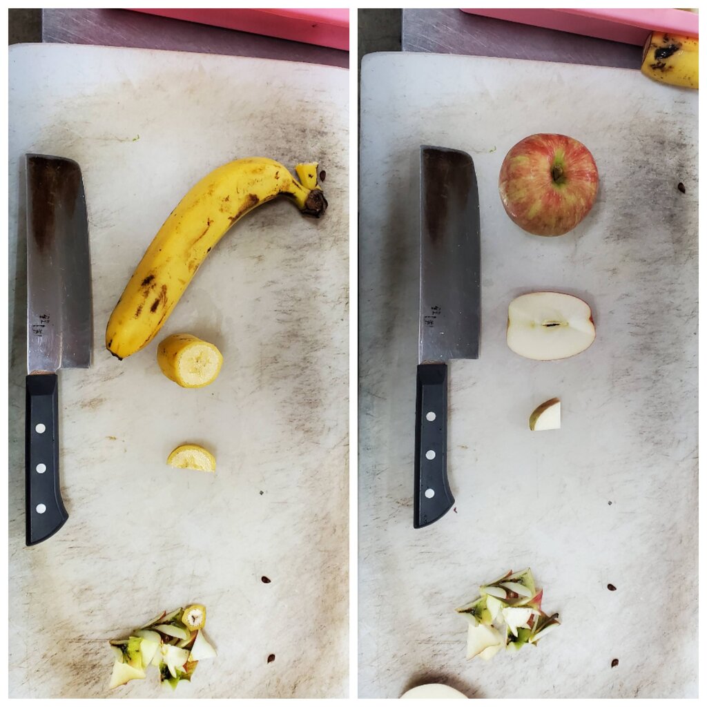 写真の真ん中のサイズ(バナナの輪切りと、リンゴ1/4)でも飲み込めるんです。