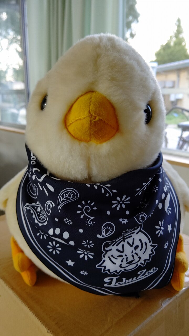 わとと売店にいる大きなヒヨコさんにサンプルマスクを着用してもらい、