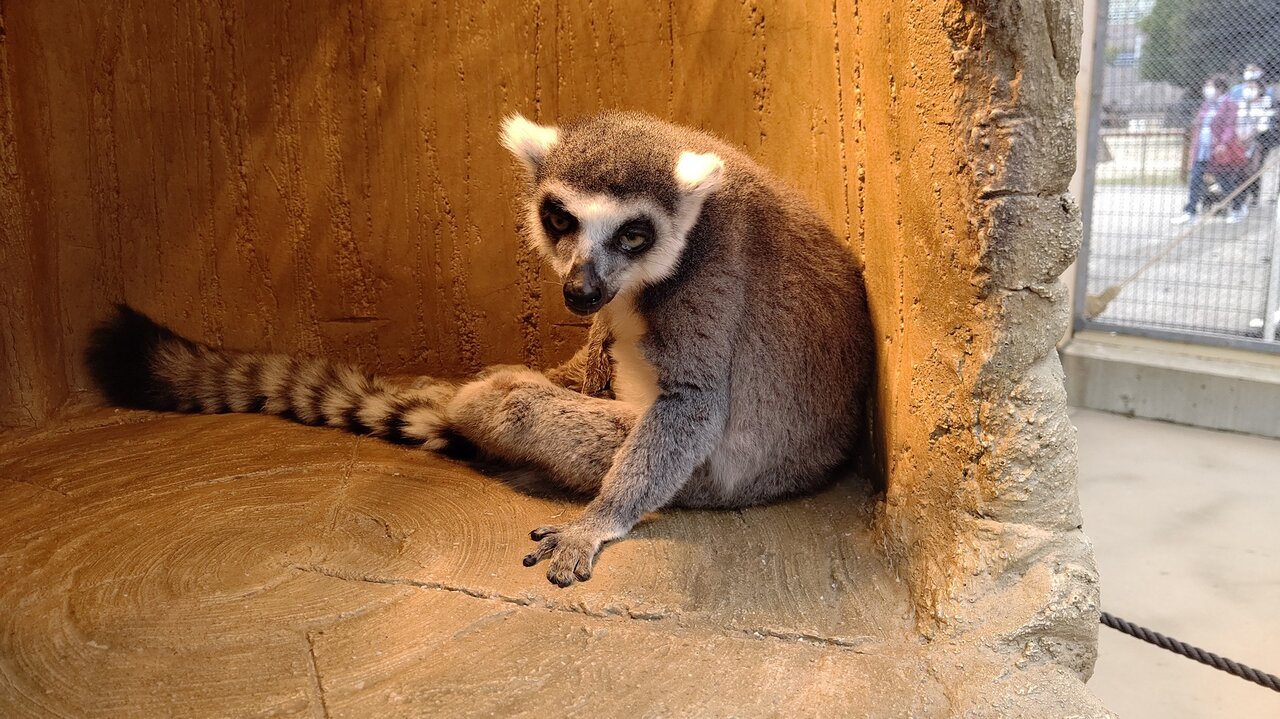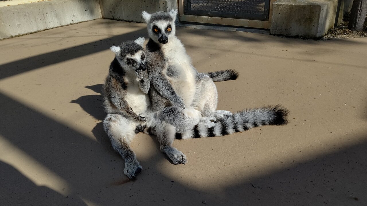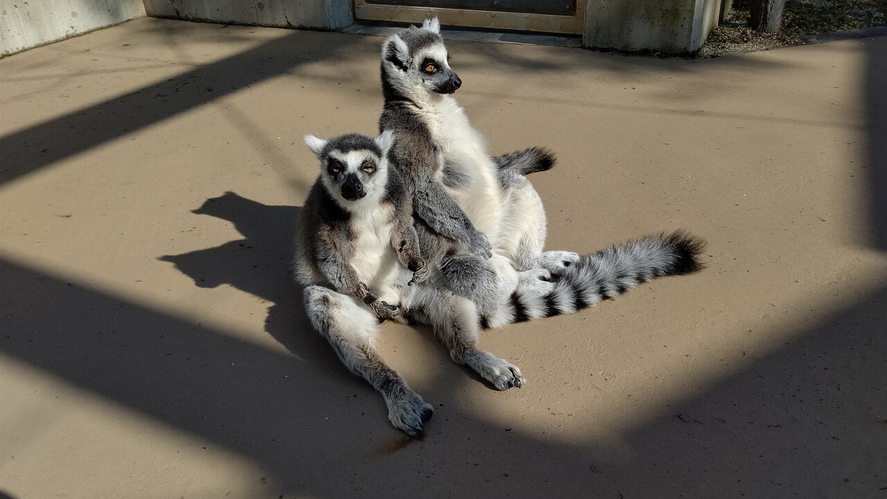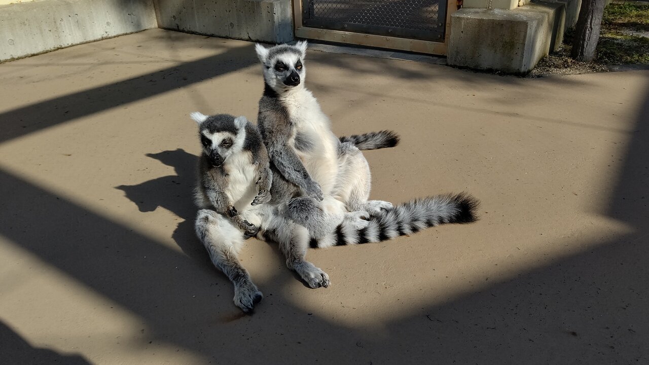 (ワオキツネザルは体温調節が苦手なため寒い日は日光浴をします。)