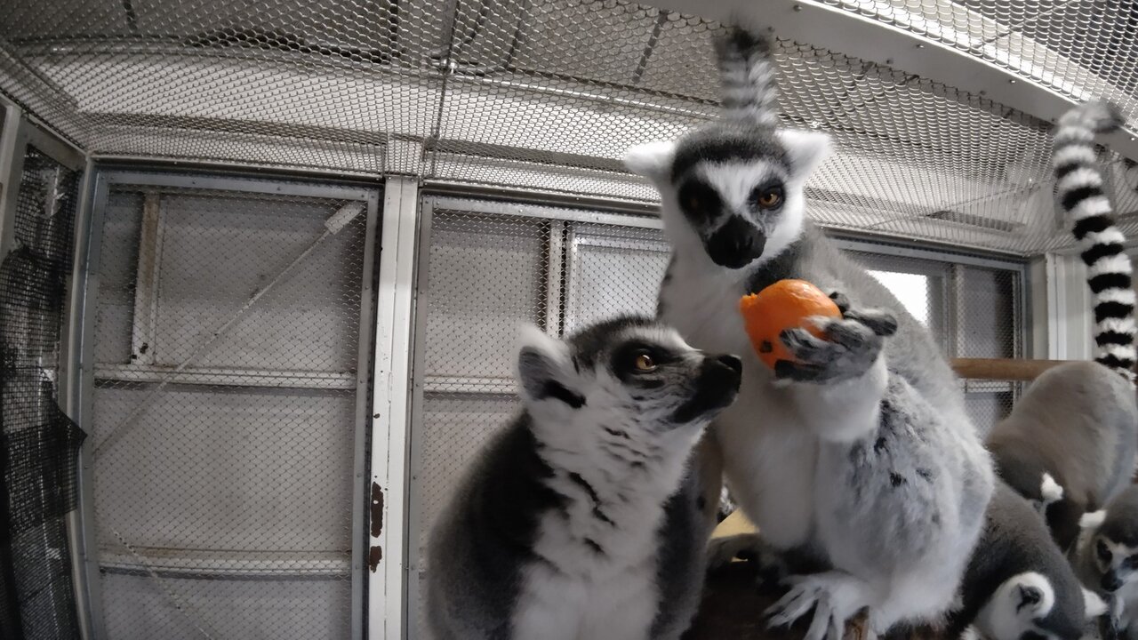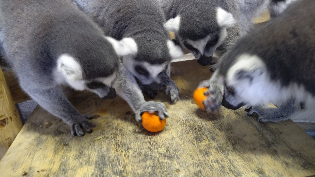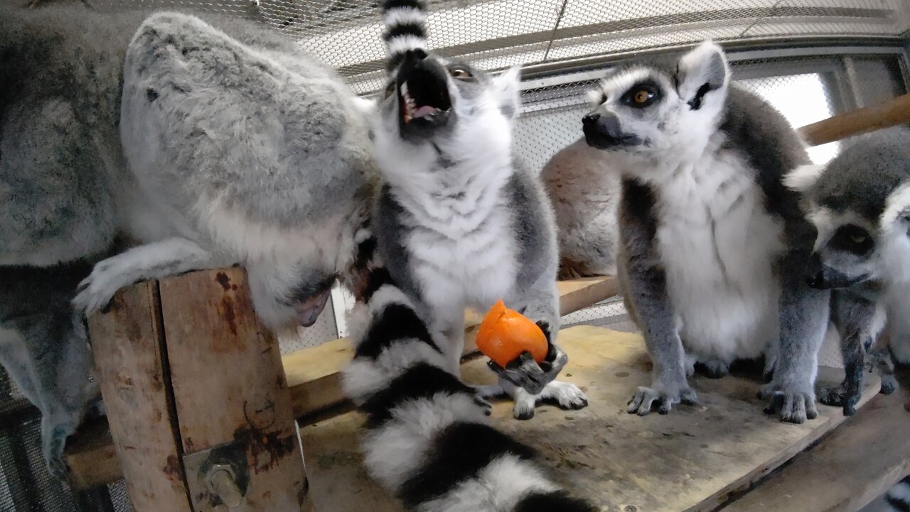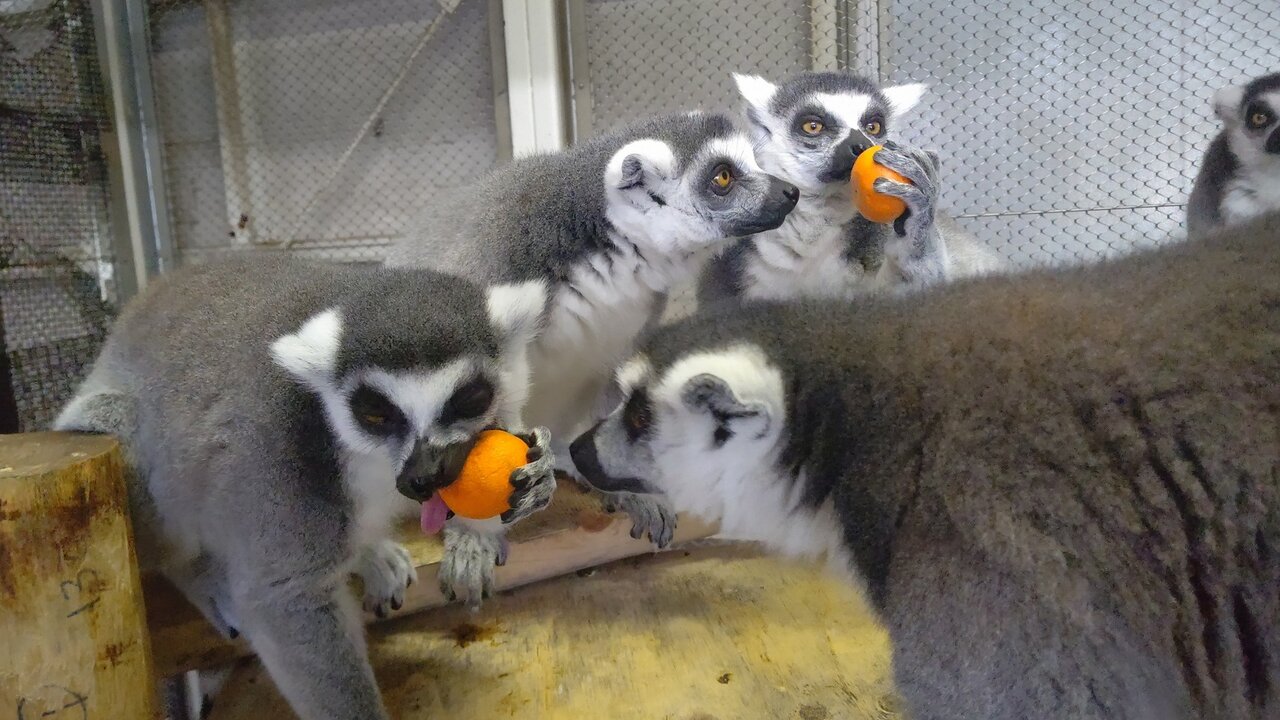 最近、家に箱でみかんが沢山あったので、ワオキツネザル達に少し持ってきました!