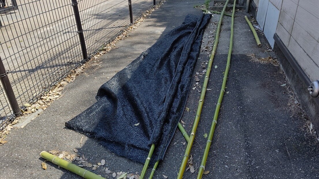 食べてもらっています)、竹にカンレイシャをタイラップで結んでいきます。