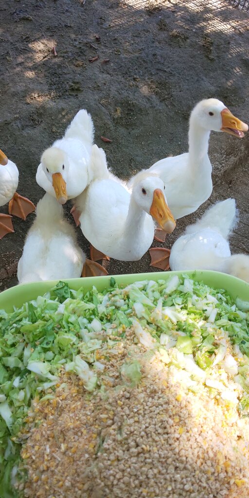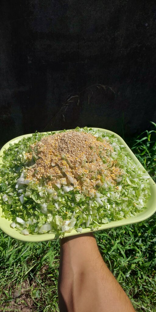 与えているのは白菜とキャベツがメインで、ふりかけてあるのはヒヨコのエサです。