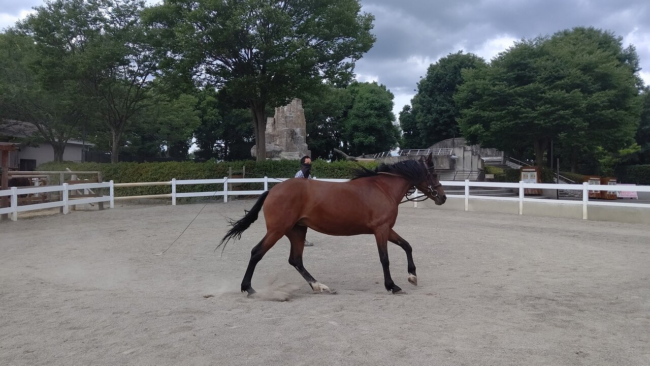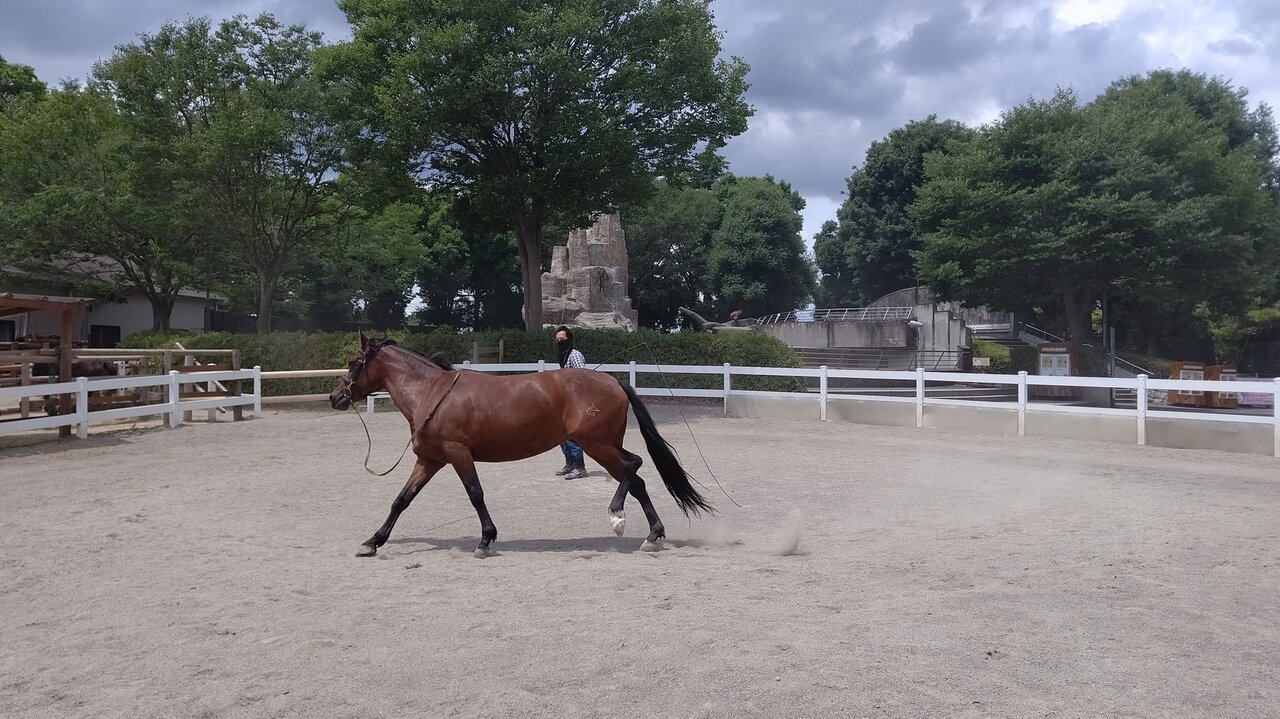 お馬さん達は運動と健康管理のため調馬索と言う運動を行います。