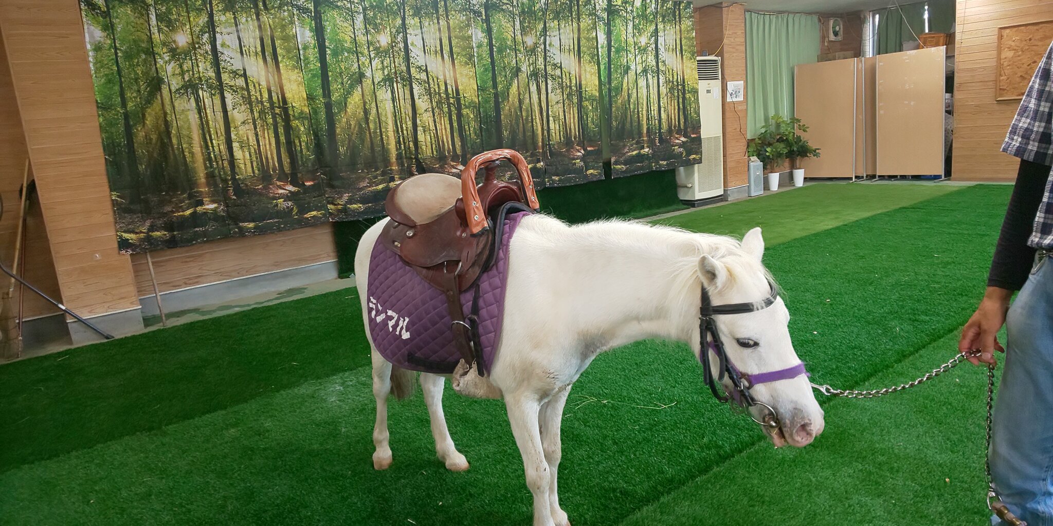 3歳〜小学3年生のお子様が、500円でお馬さんに乗り教室内を2周できます。