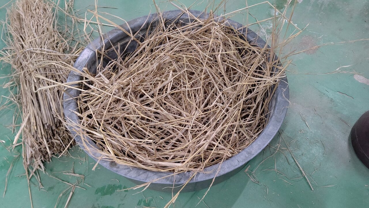タライの中にワラをいれます。