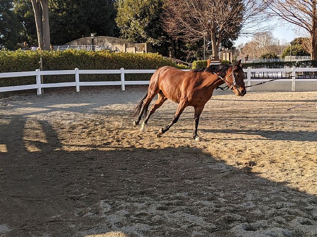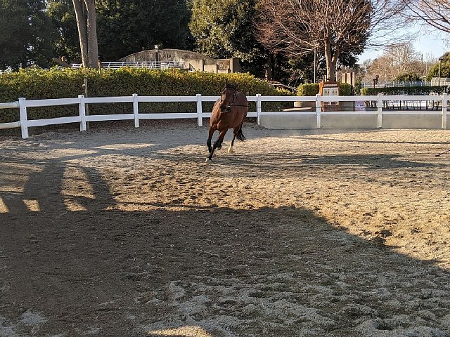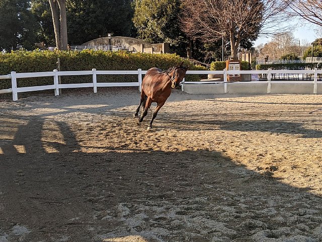 この2頭は、土日祝のようなたくさんのお客様が来園される日に、どちらか1頭が営業にでています。※(注記)平日にもでていますが・・さて当園では大きなポニーは、営業の前には必ず運動をさせています。ポニーライドで使用する馬場を走って、ひと汗かいて気持ちよくなってから乗っていただく形をとっています。ですが、開園前か開園直後に運動することが多いので、なかなかご覧になれる機会はありません。ですので、今回は写真だけでもということで。
