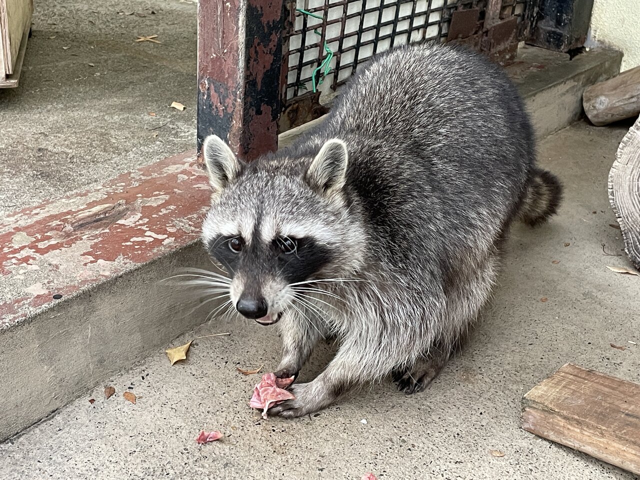食べ物を洗うことで有名なアライグマ、手先がとっても器用なため鶏頭(ニワトリの頭)もしっかり掴んで食べてしまいます。鶏頭の他にも煮たサツマイモやニンジン、リンゴなどを与えていますがこちらは一口サイズに切っているため、前足で持つかどうかはアライグマの気分次第みたいです。