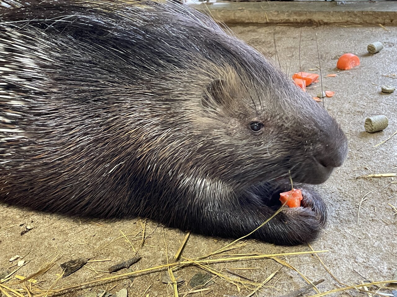 こちらは意外だった方もいるのではないでしょうか。野生下では木の根や球根などを食べているアフリカタテガミヤマアラシ、そのため東武動物公園では生のニンジンやサツマイモなど硬いものを与えています。前足で掴んで固定してから丈夫な前歯で削るようにして食べているわけですね。