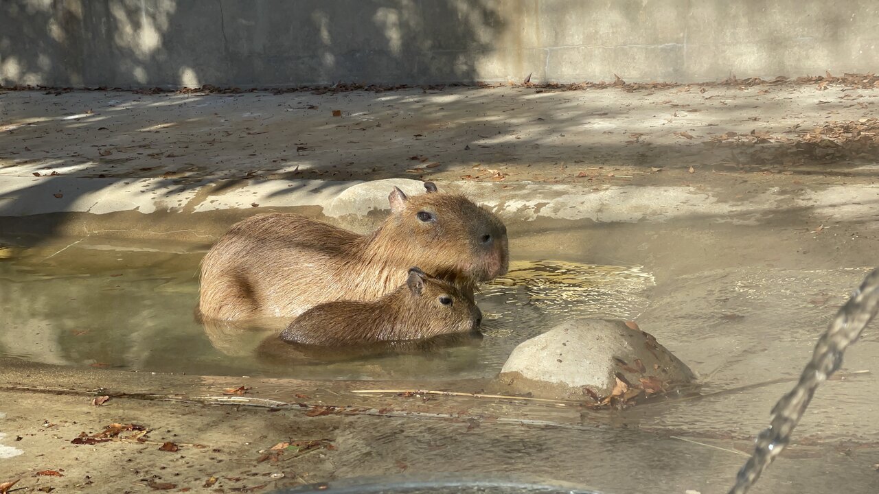 カピバラの子どもたちは夏にプールで泳いだり、冬は露天風呂に入って暖まったり、色々なことに挑戦しています。最近は体重測定ができるように練習中です!