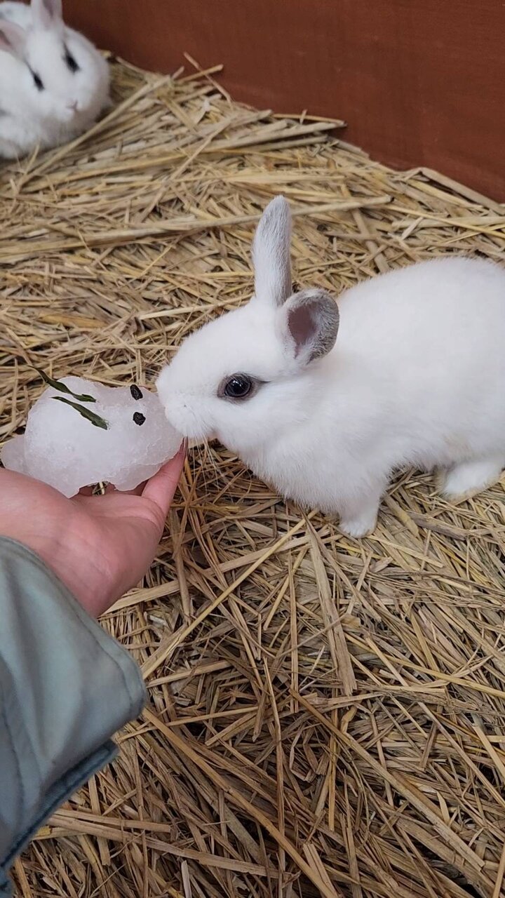 お外に連れて行くのは寒すぎるので、私が雪をウサギちゃんのもとへお届けしました。