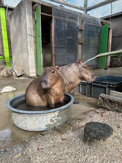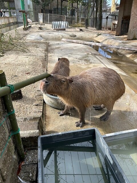 カピバラは暖かい地域で生活している動物なので、寒いのは苦手です。そのため、温かいお湯を流して暖を取ってもらっています。