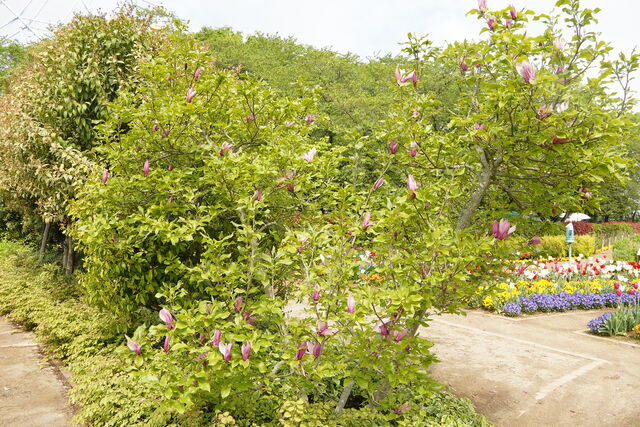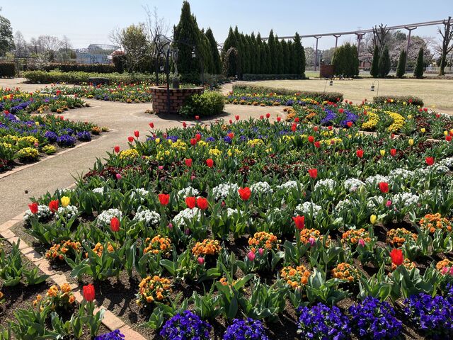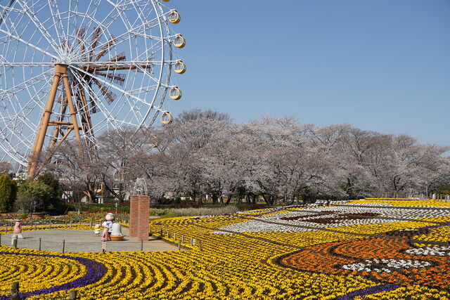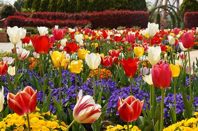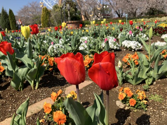 ハートフルガーデンは、ビオラ、チューリップ、ソメイヨシノ、ハナモモと