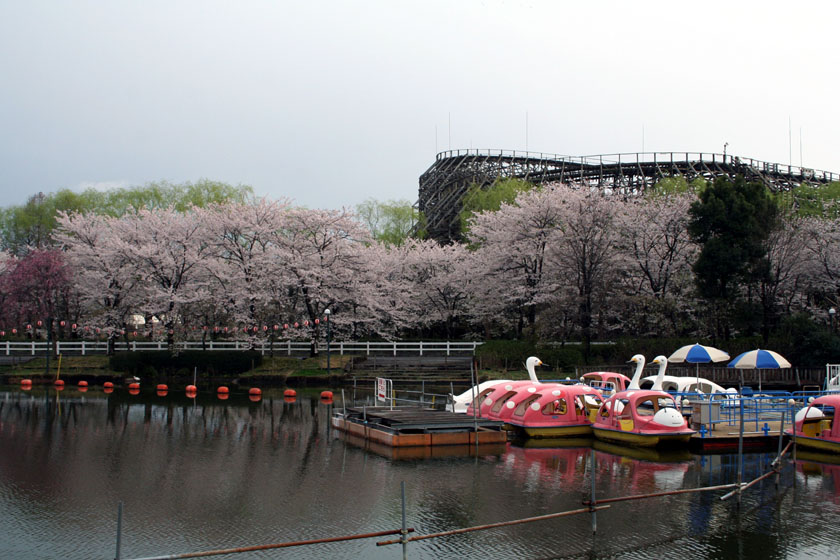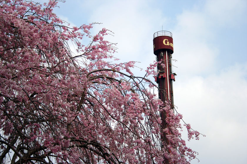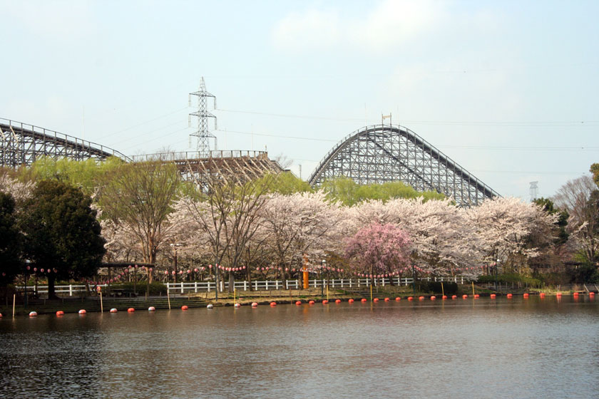 4・11ヤエレジーナ入り口すぐ横を流れている川沿いには別の種類の八重桜があり、こちらは8分咲きです。当園の名物コースター「レジーナ」の入り口から見たところです。