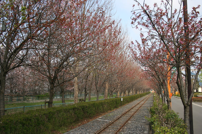 4・11ヤエ鉄道太陽のめぐみ鉄道沿いの八重桜の並木です。赤みの強いこの種類は2分咲きといったところです。