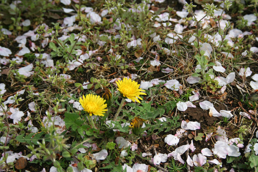 4・8タンポポタンポポがサクラの花びらの中で咲いていました。