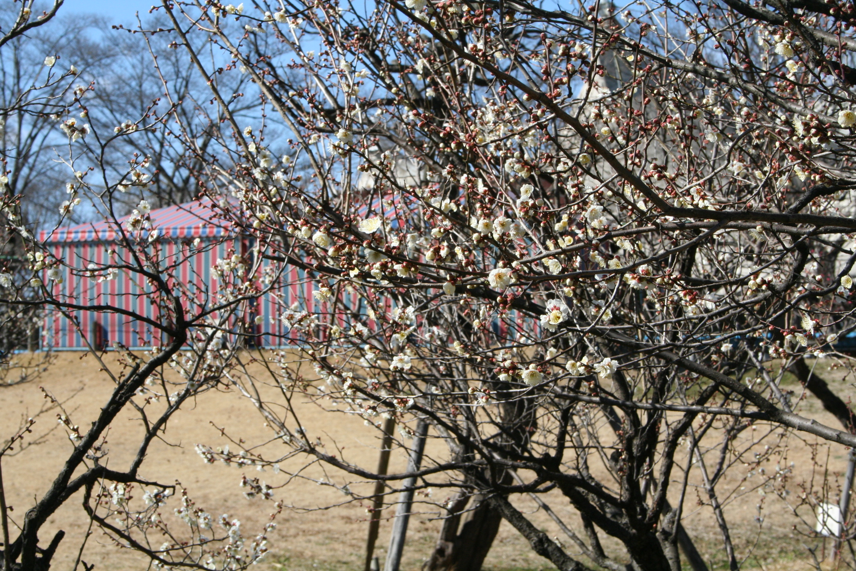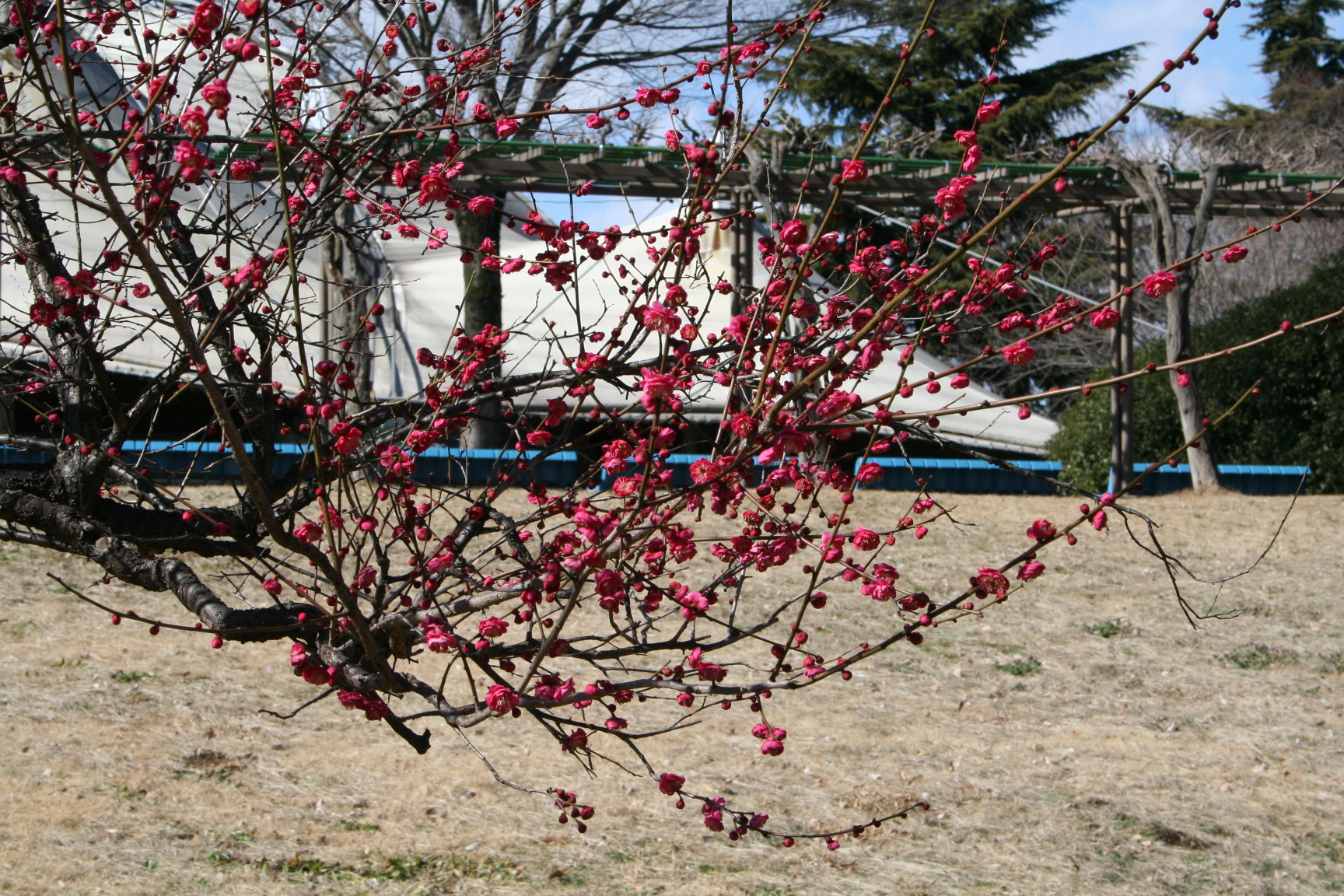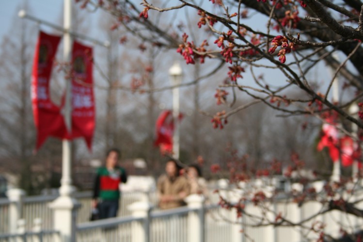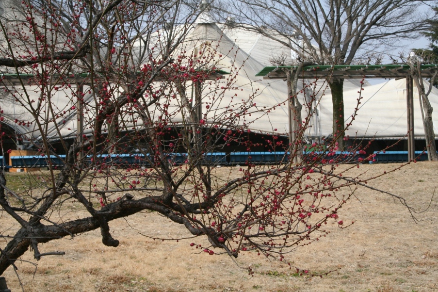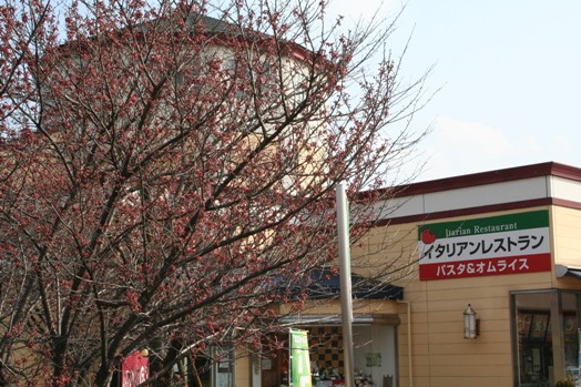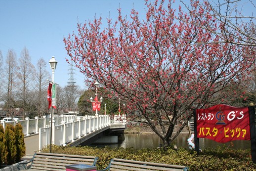 寒緋桜1この木がある場所は東ゲートに近いG−maxというアトラクションのそばです。背景に写っているのはスパゲッティがおいしいG’sレストランです。