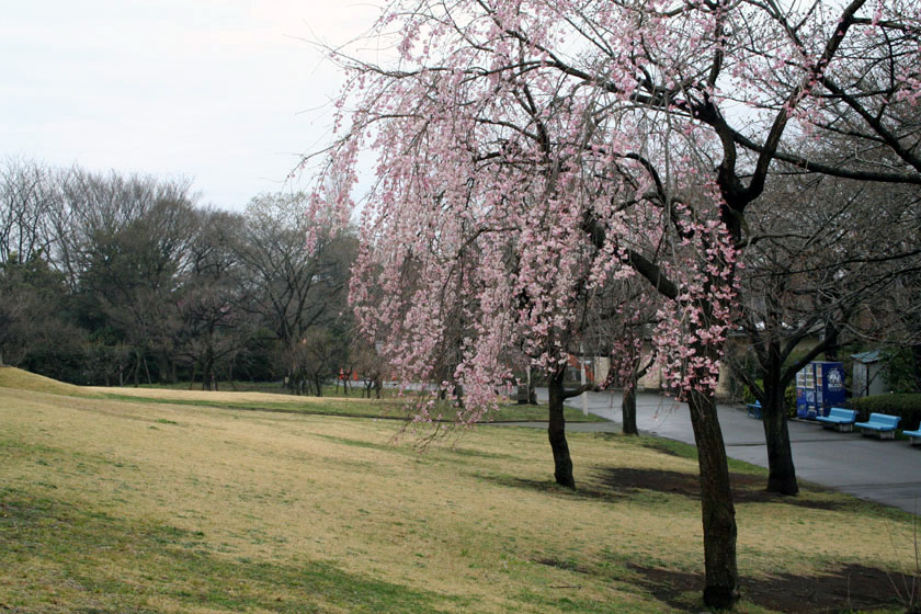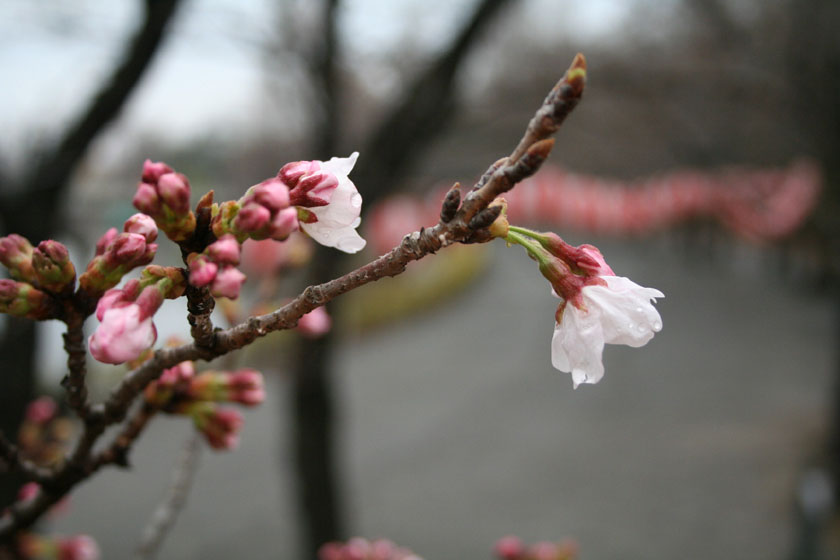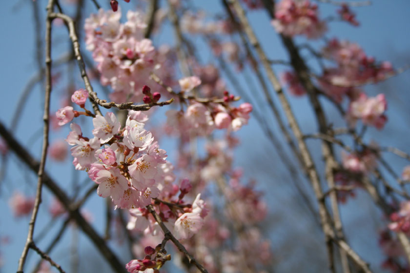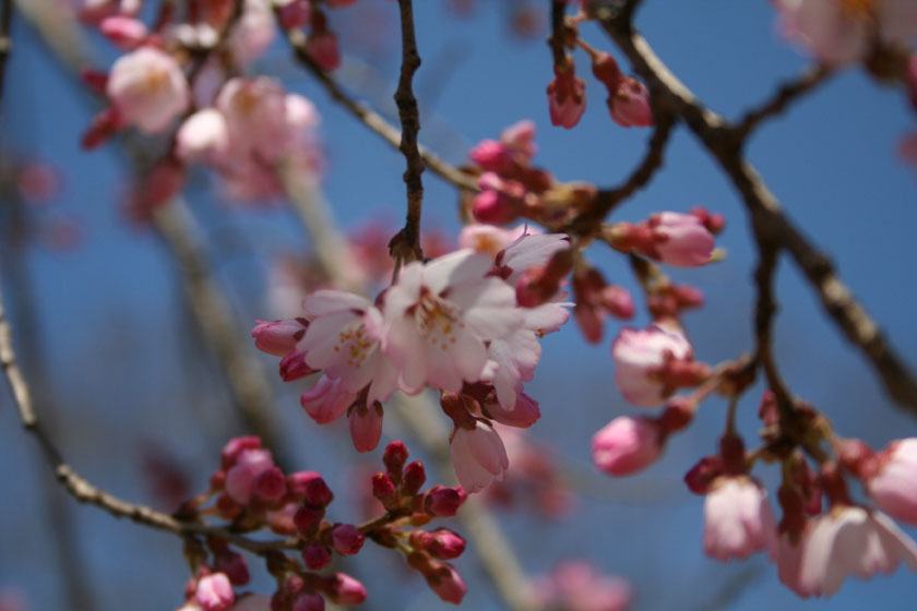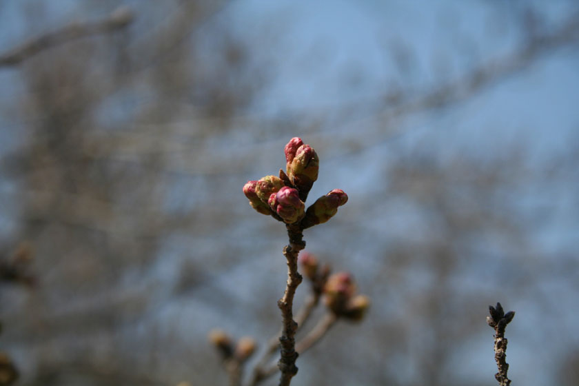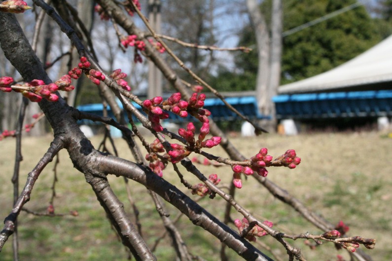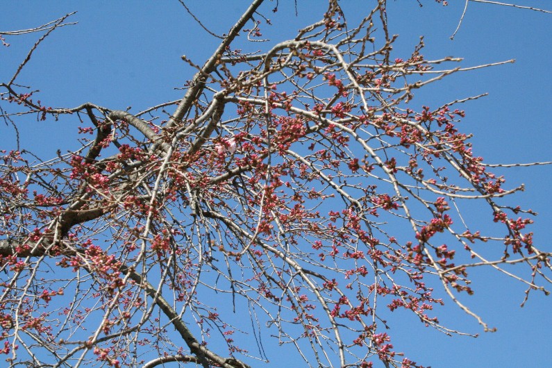 シダレザクラ1今週はまた冷たい北風が吹いていますが、ショーステージのある大テント横の枝垂桜が色づき始めました。周辺にはソメイヨシノもたくさんありますが、いつも枝垂桜のほうが一足早く開花します。