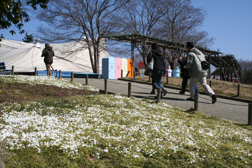 ステージ芝桜ウルトラマンメビウスショーでにぎわうハッピーオンステージをのぞいてみると入り口に芝桜がこんなに咲きそろっていました。いつもならサクラのあとに咲くのですがねえ。