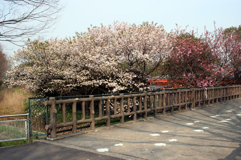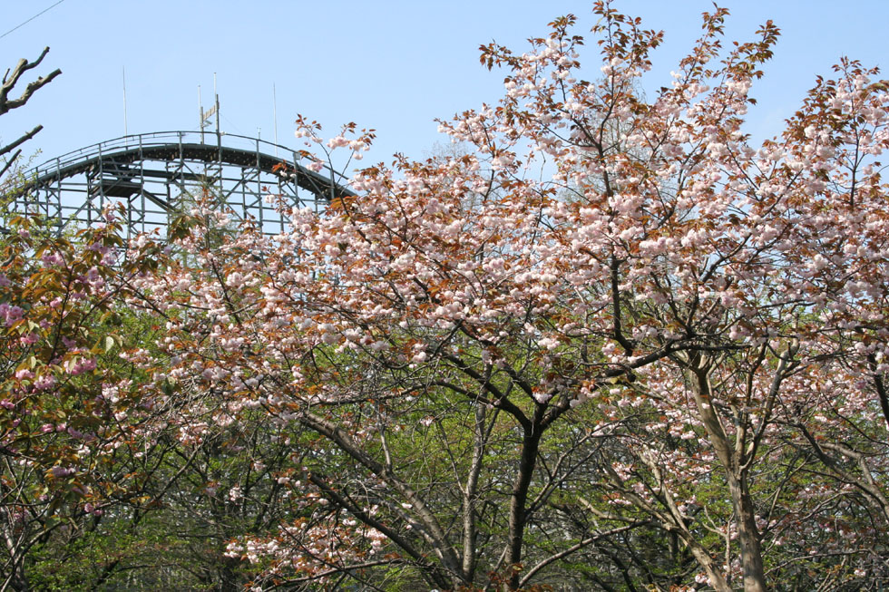 4・11ヤエレジーナ入り口すぐ横を流れている川沿いには別の種類の八重桜があり、こちらは8分咲きです。当園の名物コースター「レジーナ」の入り口から見たところです。