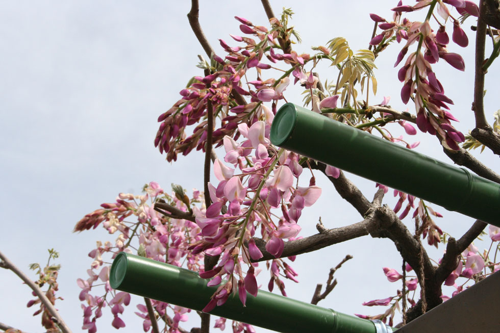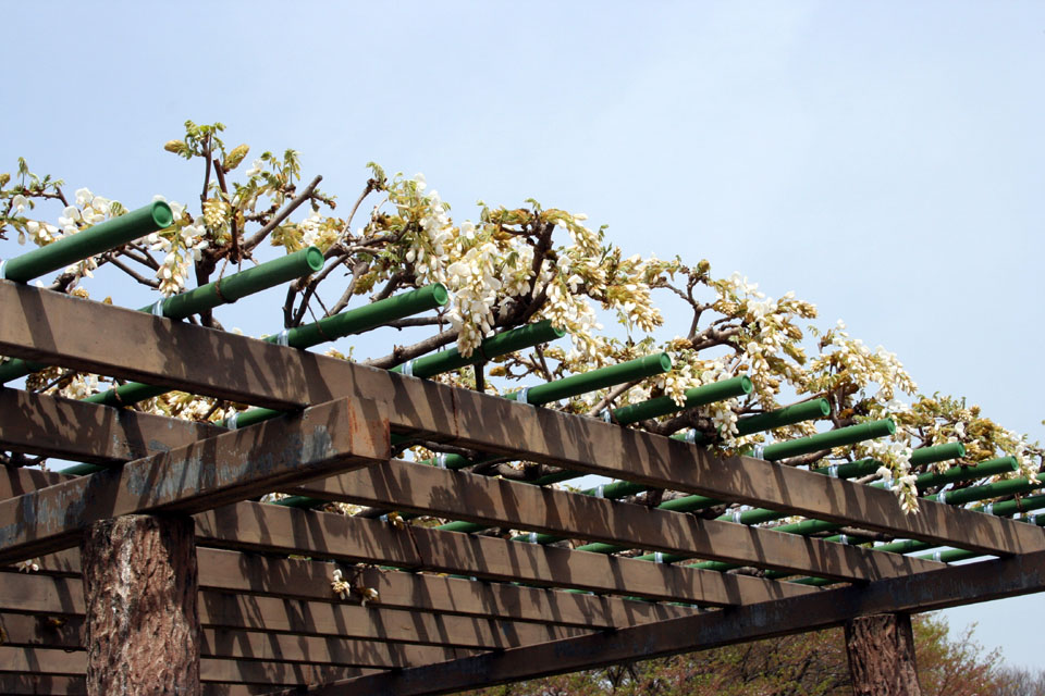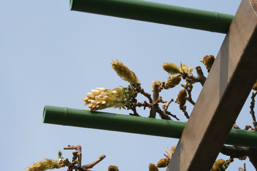 4・11フジ花穂園内には各所に日よけのパーゴラがあり、フジ棚になっているものが多いのですが、今年はもう花穂が伸びはじめています。ゴールデンウィークを待たずに咲いてしまうかもしれません。