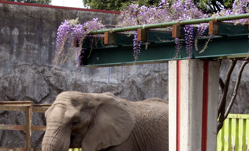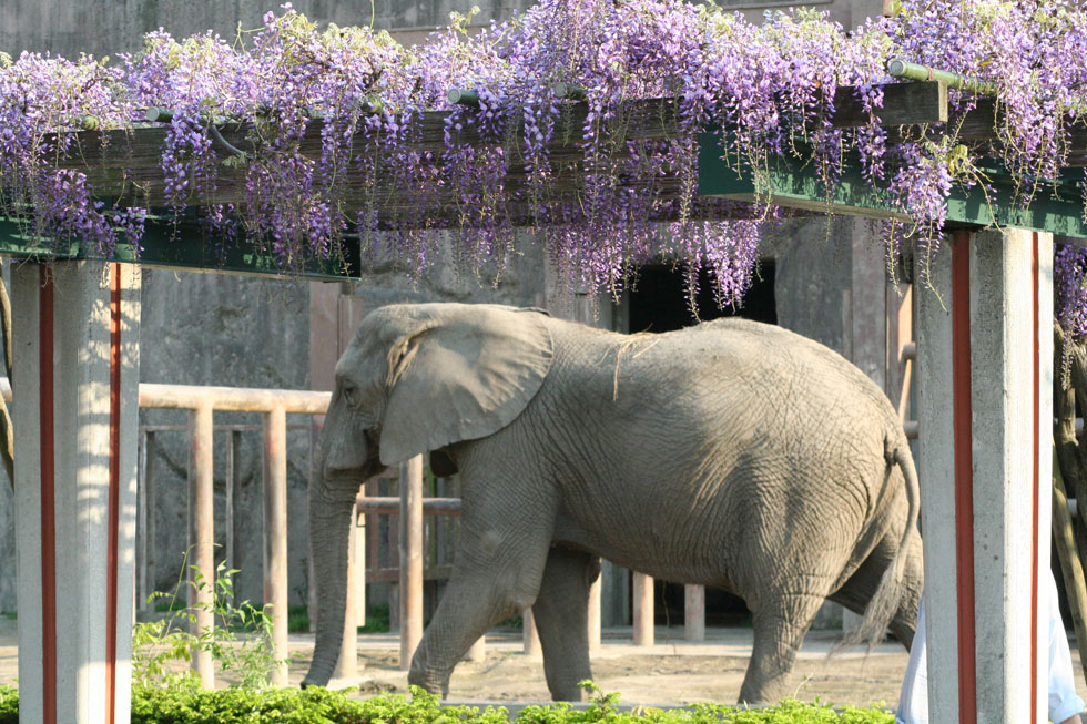 4・26ゾウとフジ1アフリカゾウ舎の前の藤棚も現在こんな具合に見ごろとなっています。GW中は花穂の先まで咲きそろった満開状態をお楽しみいただけるのではないでしょうか。