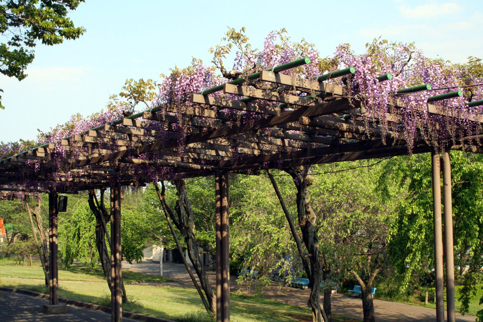 来る29日の祝日に出演俳優の高橋光臣さんと三上真史さんを迎えて開催される轟轟戦隊ボウケンジャーショーの会場であるハッピーオンステージの藤棚もちょうどそのころが花盛りになりそうですョ。