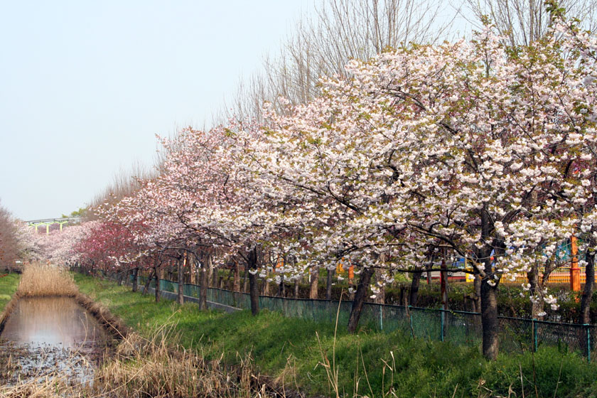 4・11ヤエ鉄道太陽のめぐみ鉄道沿いの八重桜の並木です。赤みの強いこの種類は2分咲きといったところです。