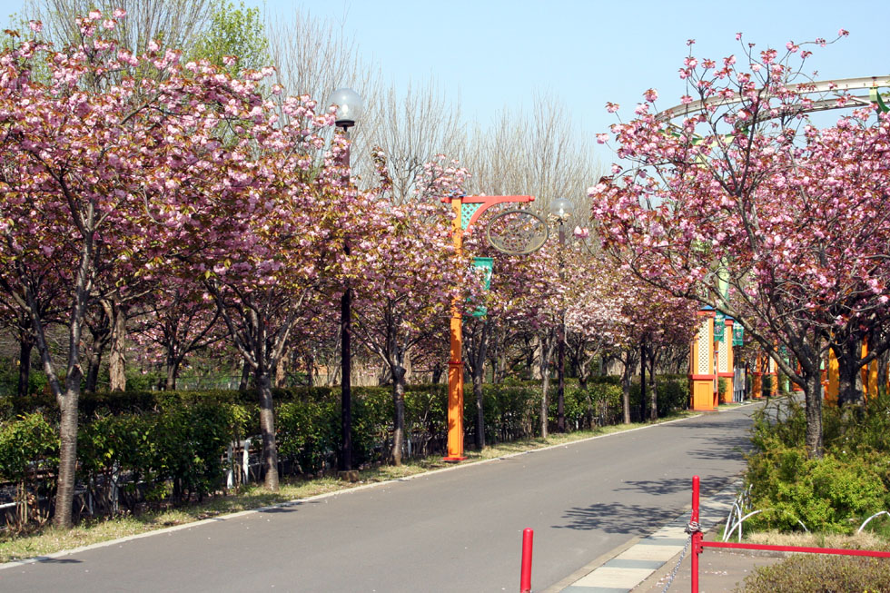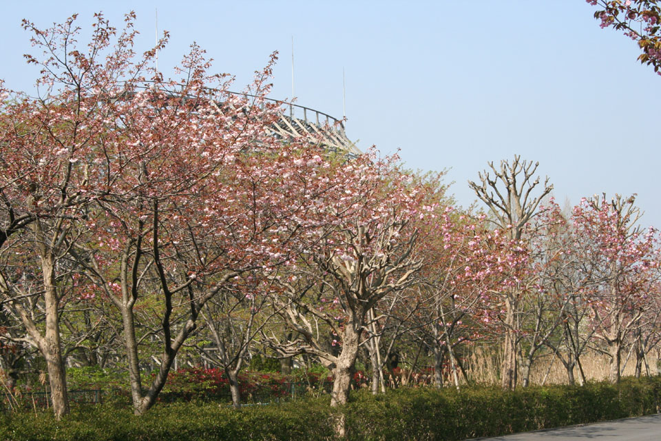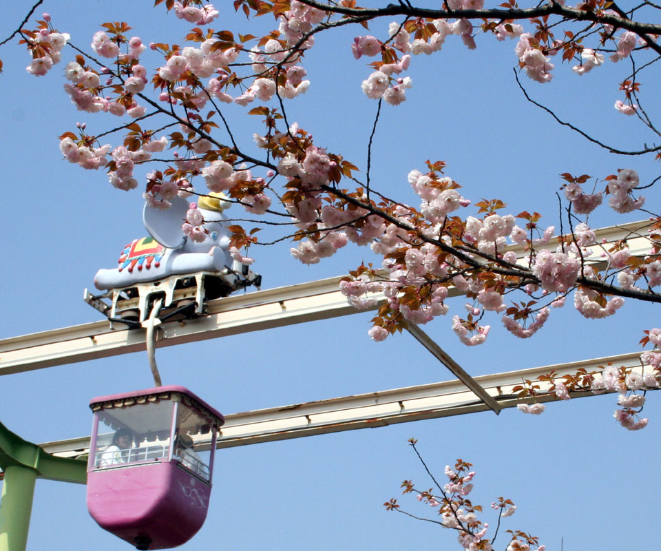 4・12ラブと八重サファリタイプのゴーカート、アフリカートがある第2プレーランド入り口の八重桜。バックは人気のアトラクション、スカイラブです。