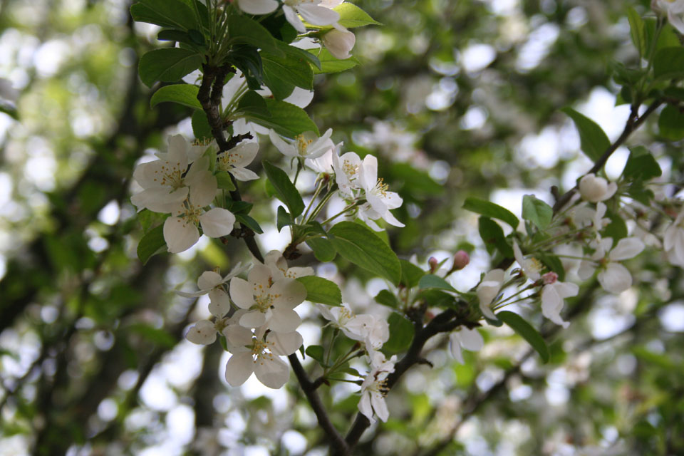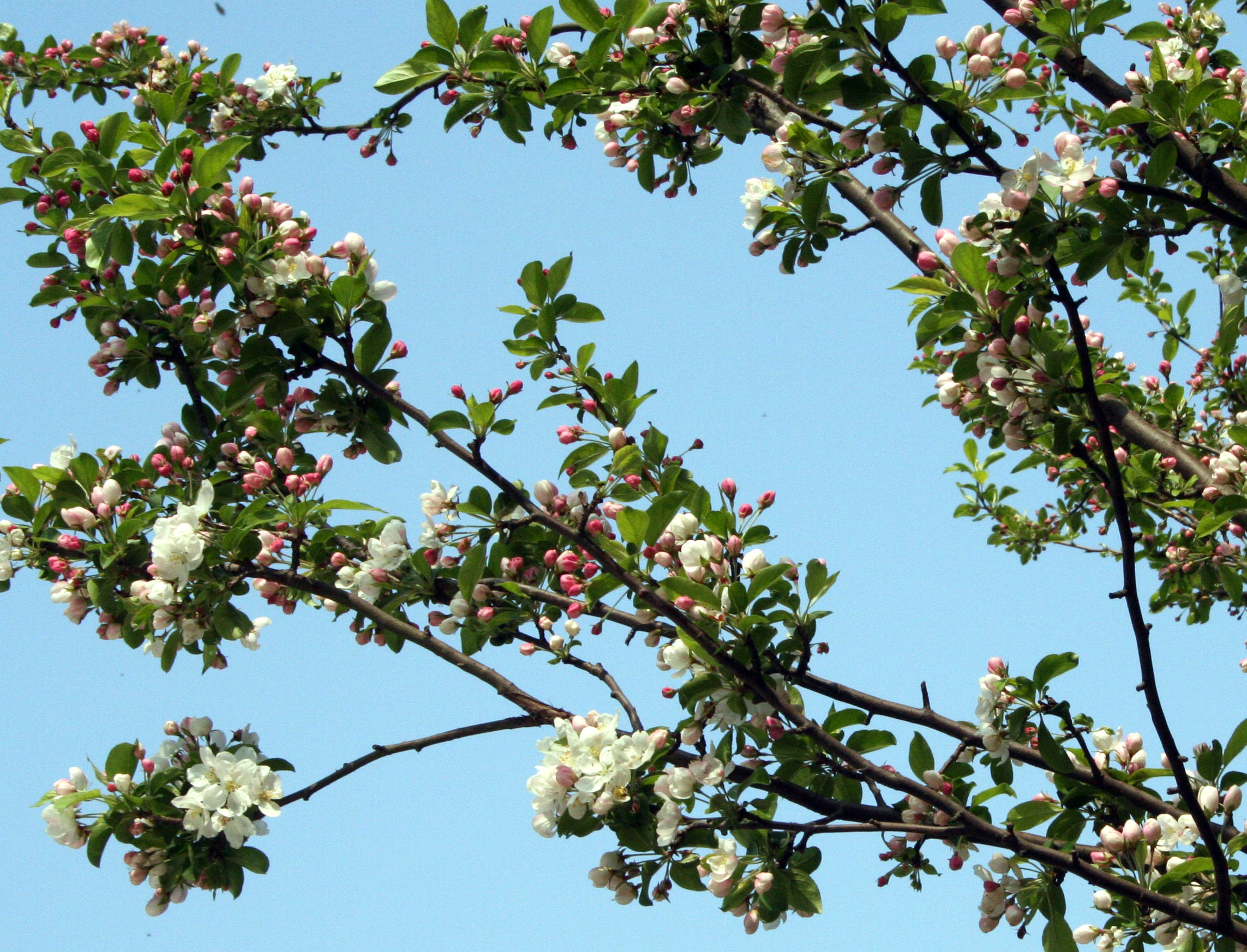 4・15ヒメリンゴトッピー広場のはしっこにあるヒメリンゴも八分咲きとなりました。白い花がたくさんついてみごとです。おとなりのカリンの花はあまりめだちませんね。