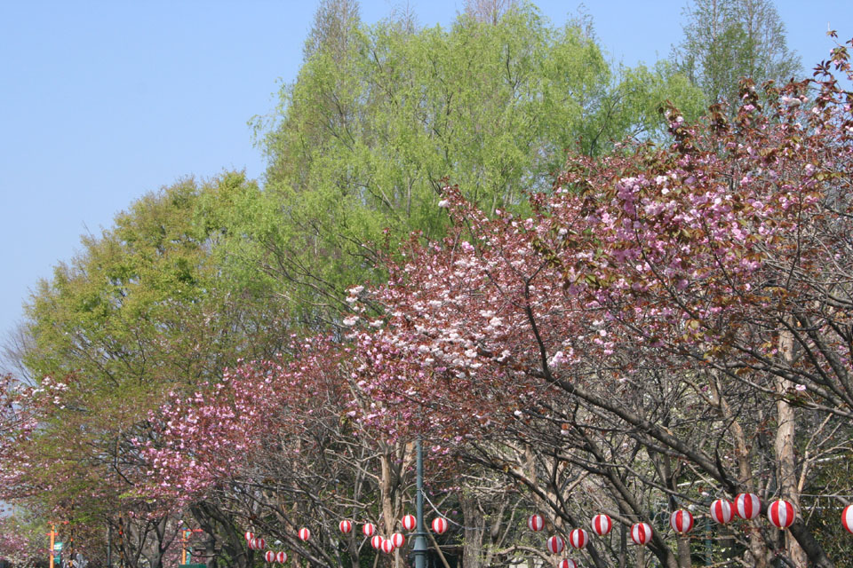 4・15八重レジーナ近くの八重桜の並木もすっかり満開です。花のトンネルをお楽しみいただけます。