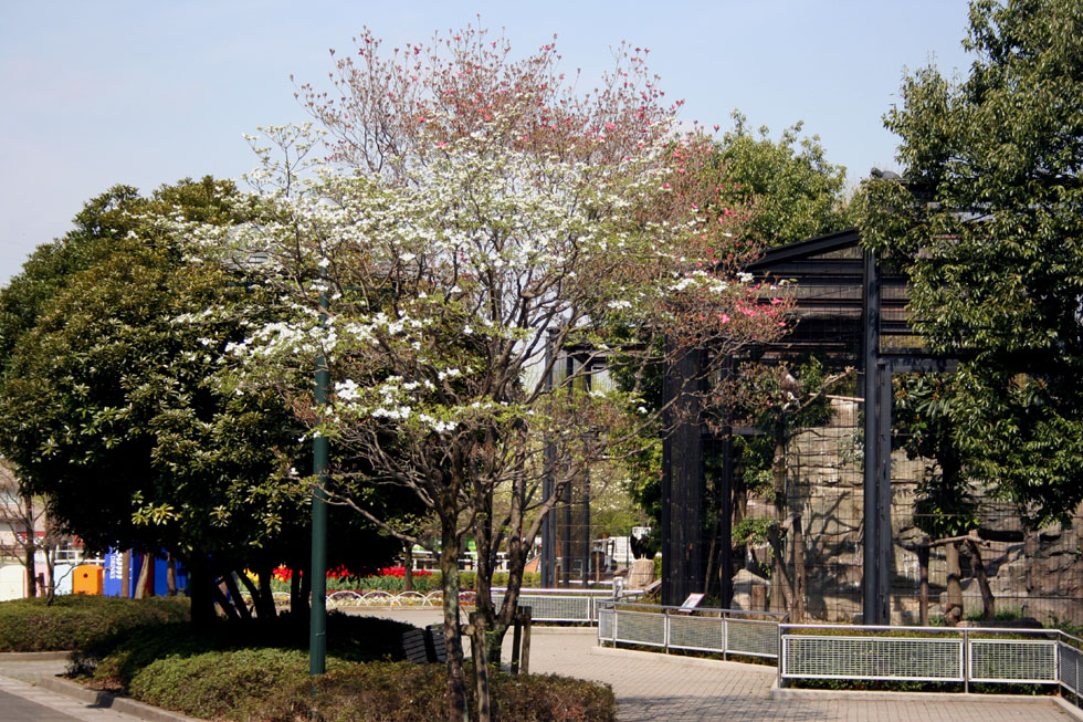 4・21ハナミズキオオワシやシロフクロウがいる猛禽舎前のハナミズキです。今年はハナミズキの開花も早いようですね。