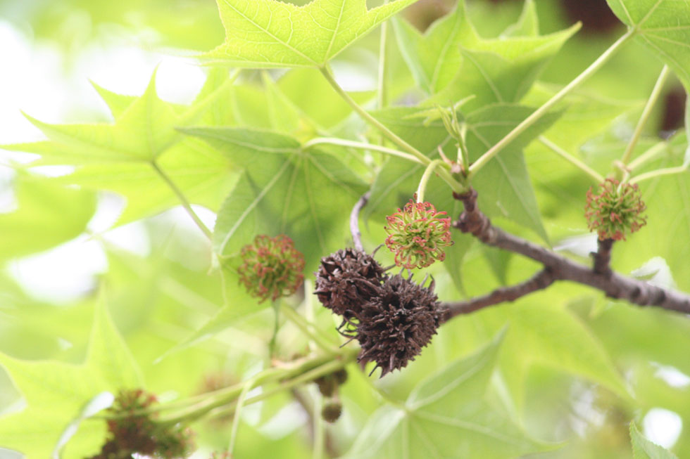遊園地のゲームセンターカーニバルの前に秋にきれいな紅葉となる木があります。モミジバフウといいます。フウというのは楓と書きます。楓という字は日本ではカエデと読ませますが、中国では別の木だそうで、その木を音読みのまま「フウ」というそうです。葉が落ちると鈴のような小さな球果がたくさん枝にさがります。