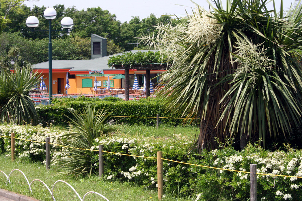 5・14ニオイシュロラン2こちらはアフリカサバンナへと向う橋のたもとに植えてあるニオイシュロランです。うしろに見えている建物は日本食がおいしい中央レストランです。