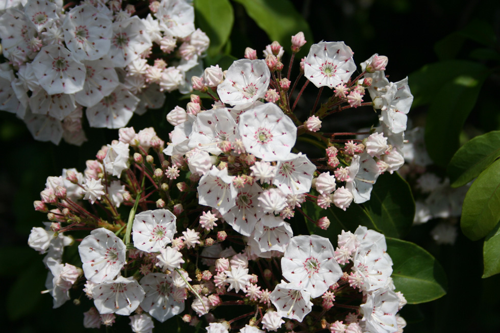 5・14カルミア2つぼみの時はお菓子の金平糖のようですよね。それが開くと小さな花の中にピンクの模様があってなかなかきれいです。でも日本人のイメージのシャクナゲとは全然ちがいます。