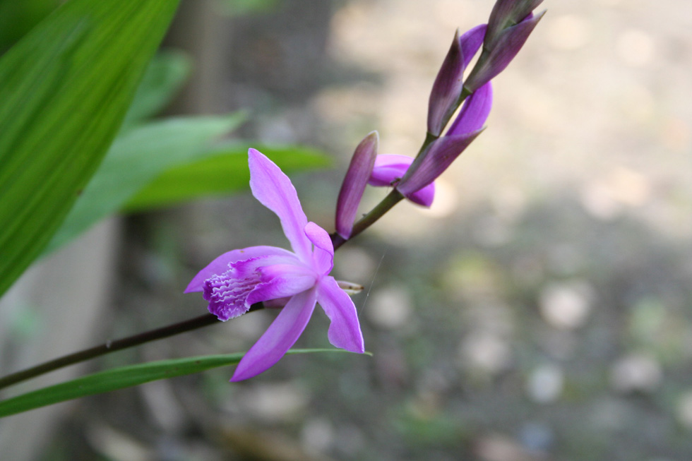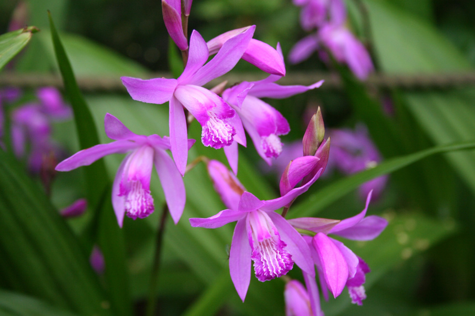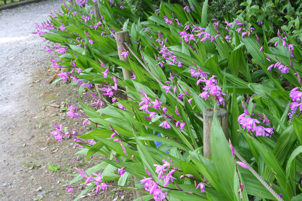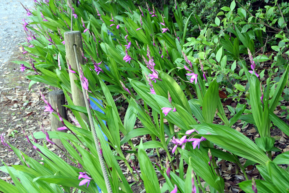 5・9紫蘭2こちらはシラン(紫蘭)です。この花はゲームセンターカーニバルからハッピーオンステージへ向う途中に咲いています。こちらもまだ咲き始めですが、ぜひ探してみてください。