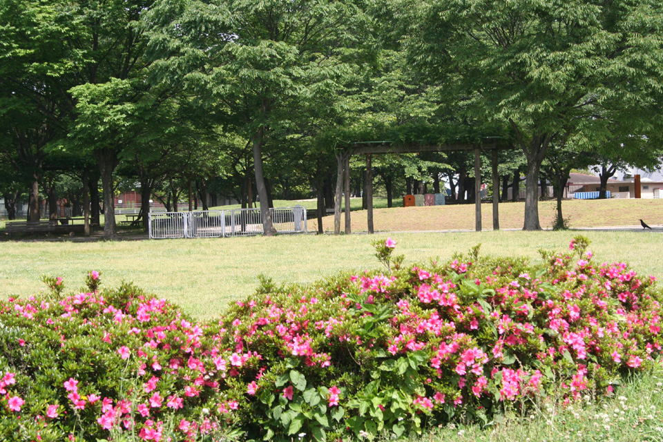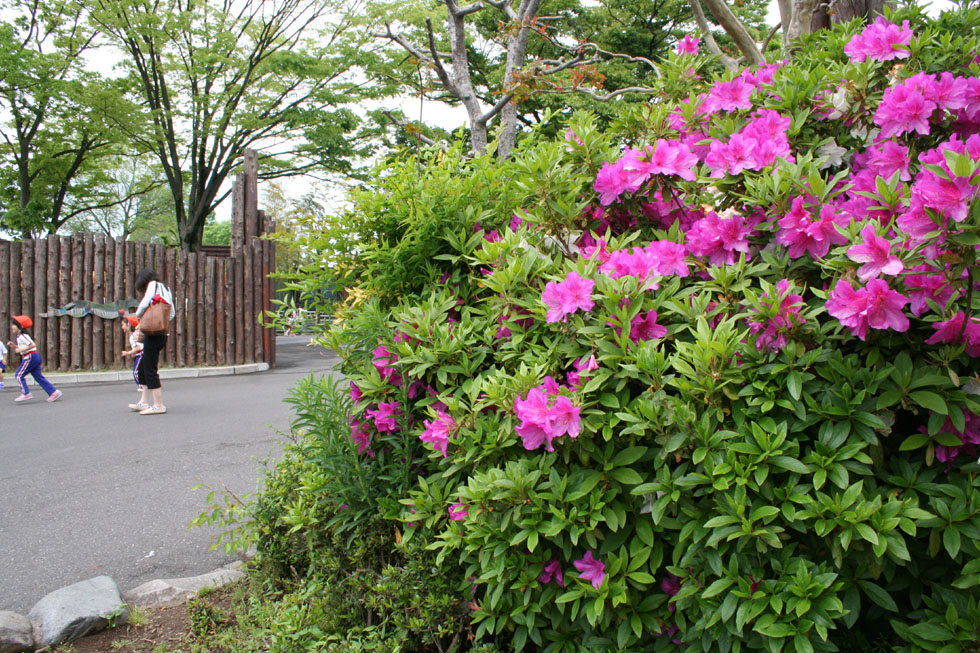 5・27サツキ広場遠足の子どもたちや家族連れでにぎわうトッピー広場の入口もサツキで飾られています。近くにあるアメリカシャクナゲ(カルミア)もまだきれいに咲いています。